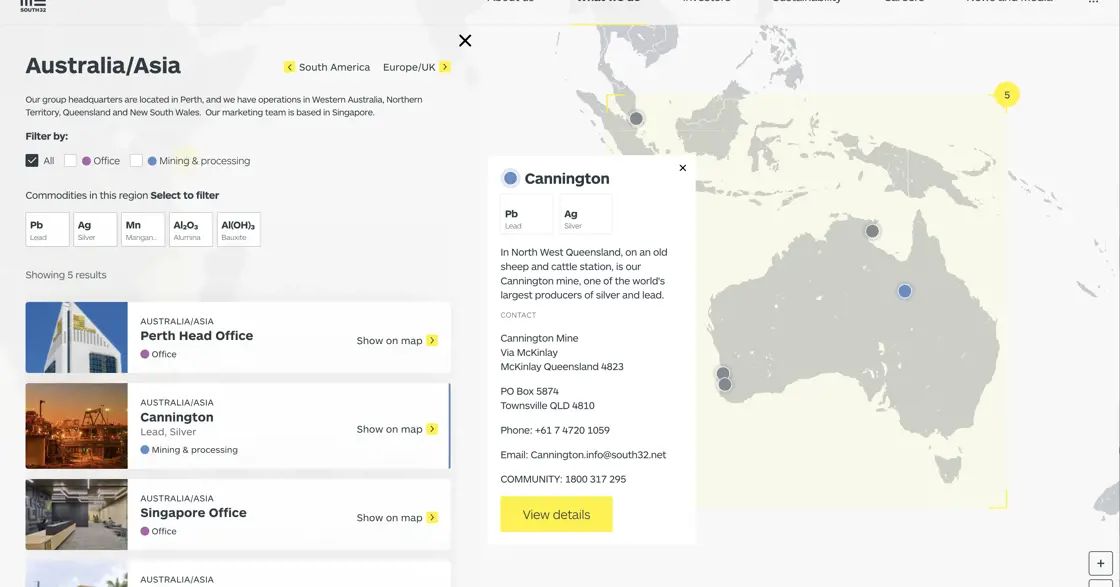 A successful example of this approach in action can be seen in equ’s work with South32, where an interactive map allowed users to explore global operations by location, mineral type, and operational details. Rather than relying on a static list, the map format created an inviting experience that empowered users to navigate the information based on their interests. This immersive approach not only increased engagement but also communicated South32’s operational scope in a way that a static presentation couldn’t.