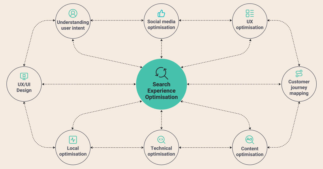 SXO encompasses the optimisation of all components within the customer journey, ranging from voice search results, search result pages, rich snippets, map listings, websites, apps, social media profiles, and other digital platforms. This optimisation extends to both content and technical aspects.