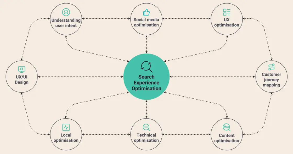 SXO encompasses the optimisation of all components within the customer journey, ranging from voice search results, search result pages, rich snippets, map listings, websites, apps, social media profiles, and other digital platforms. This optimisation extends to both content and technical aspects.