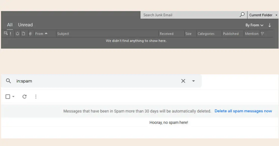 A powerful example of this is in something as mundane as an inbox spam folder. This seemingly low-value space of the internet doesn’t really serve a purpose after it’s been cleared—but UX copywriting takes this and turns it into another tool for your brand. Look at Outlook versus Gmail.