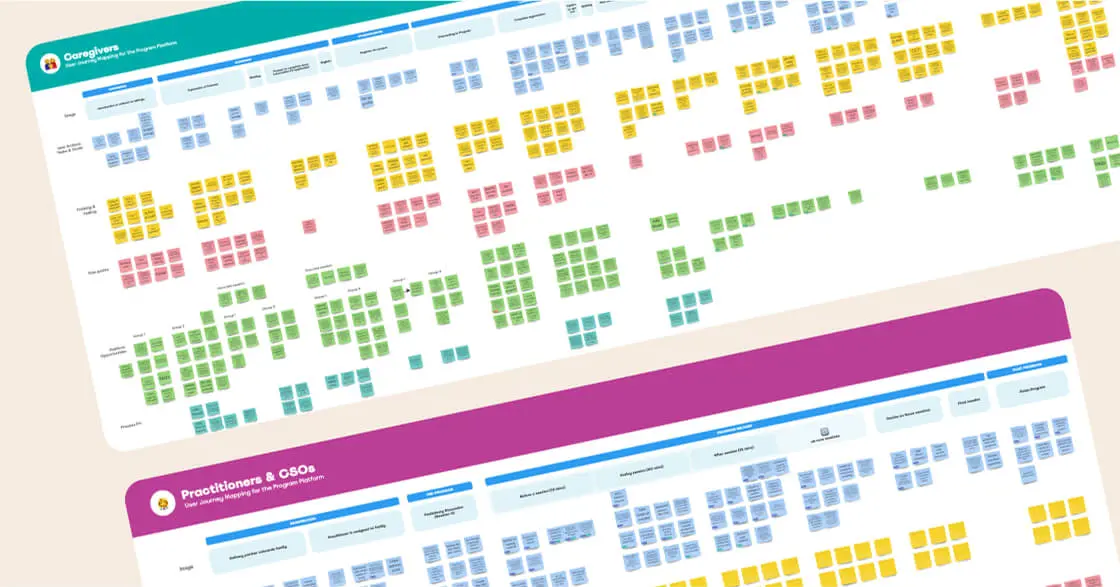 Extensive customer journey mapping was conducted to understand the interactions of both caregivers and practitioners with the program. For caregivers, this process explored how they entered the program, engaged with practitioners, and navigated their baby’s developmental journey. For practitioners, journey mapping focused on their role in delivering Inklings, from initial family contact through to monitoring progress and outcomes.